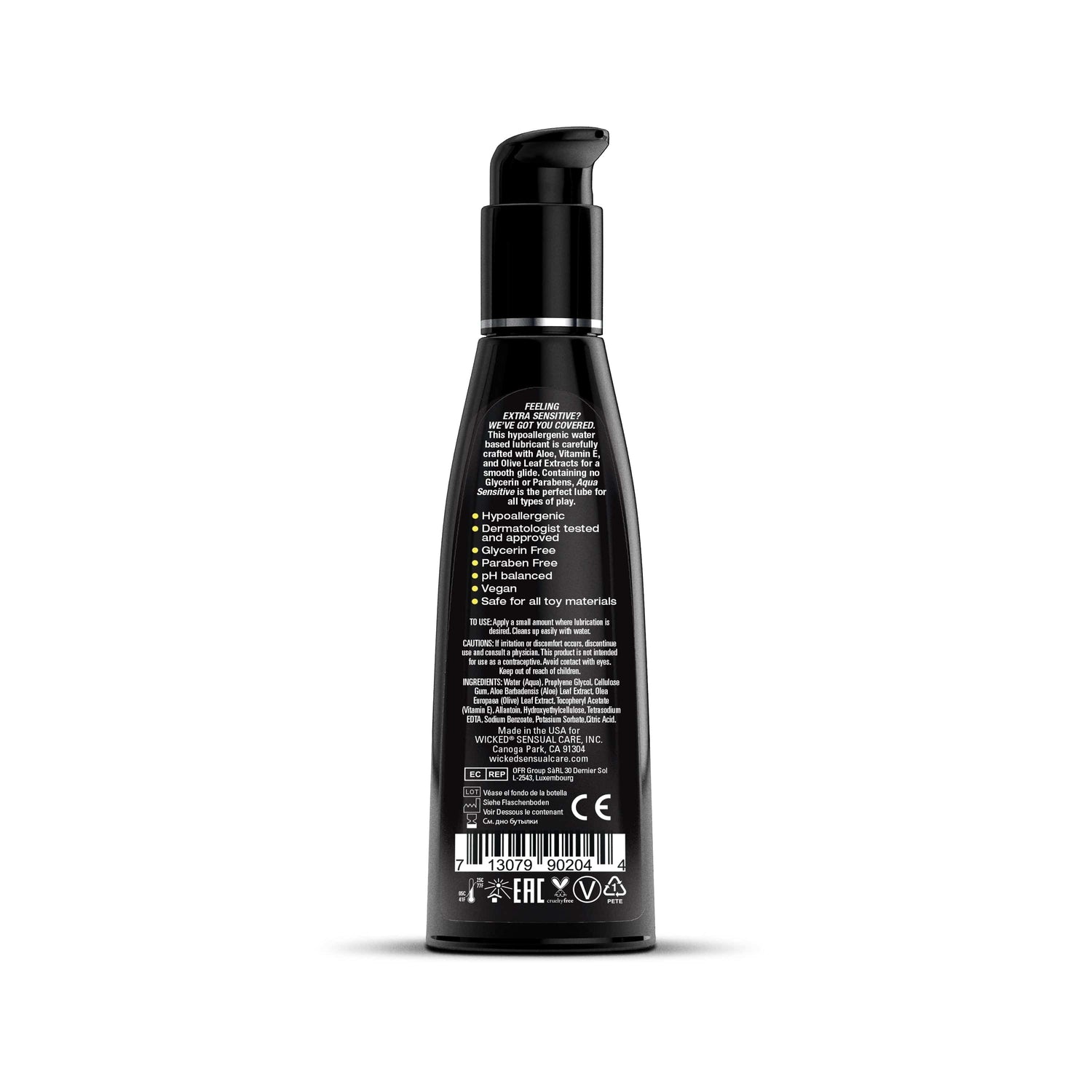 Indulge yourself and your most delicate areas with this incredibly smooth and satiny, hypoallergenic personal lubricant. The luxurious Glycerin and Paraben-free formula is specifically crafted for sensitive skin to heighten sensation and arouse satisfaction. Enhanced with skin nurturing Aloe and Olive leaf extract as well as Vitamin E, Wicked Aqua Sensitive will caress your body and provide new levels of pleasure.